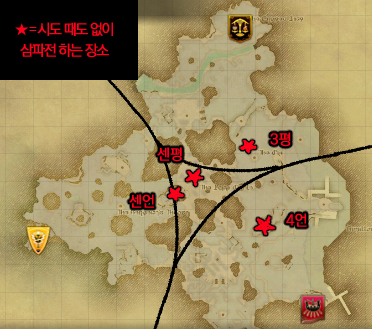 3평 = 3시 평지 (※2평이라 불린다고 합니다※) / 4언 = 4시 언덕 / 센평 = 센터 평지